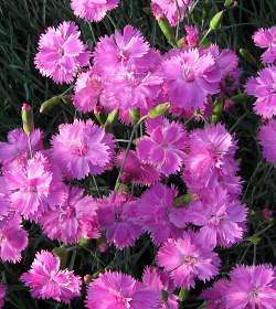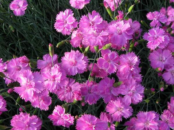 Гвоздика перистая Rose Double (Роуз Дабл). Ярко-розовые махровые цветки с сильно рассеченными фестончатыми лепестками. Листья серебристые. Куртина плотная, в цвету достигает 25 см. Цветение невероятно обильное. Великолепно смотрится с пионами. Имеет очень сильный горько-сладкий гвоздичный аромат.