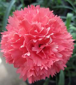 Гвоздика Шабо коралловая (1 л). Цветы крупные, диаметром 5-8 см, махровые. Лепестки цветов разной формы — складчатые или гофрированные, края зубчатые или глубоко-рассеченные. Цветет до глубокой осени, украшая как клумбы, так и вазоны, подвесные цветочные ящики, кашпо.