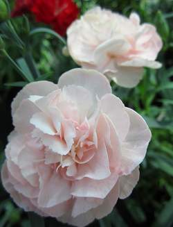 Гвоздика Шабо нежно-розовая (1 л). Цветы крупные, диаметром 5-8 см, махровые. Лепестки цветов разной формы — складчатые или гофрированные, края зубчатые или глубоко-рассеченные. Цветет до глубокой осени, украшая как клумбы, так и вазоны, подвесные цветочные ящики, кашпо.