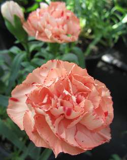 Гвоздика Шабо персиковая с красным штрихом (1 л). Цветы крупные, диаметром 5-8 см, махровые. Лепестки цветов разной формы - складчатые или гофрированные, края зубчатые или глубоко-рассеченные. Цветет до глубокой осени, украшая как клумбы, так и вазоны, подвесные цветочные ящики, кашпо.