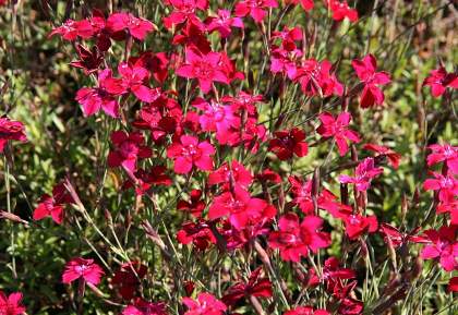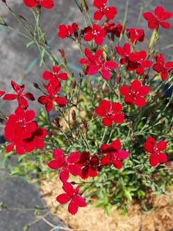 Гвоздика Leuchtfunk (Лойхфунк). Образует плотные ковры очень быстро. Ее соцветия поднимаются на высоту около 15 см. С июня до августа распускаются многочисленные, огненно красные, миниатюрные цветки гвоздики. Они появляются над голубовато зеленой, очень нежной, травяной, вечнозеленой листвой. Цветки собраны в рыхлые соцветия. Они многочисленные, простые, пятилепестковые, размером около 1,5-2 см в диаметре. Ароматные.