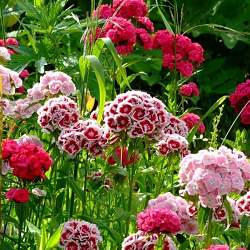 Гвоздика турецкая. Травянистое растение с многочисленными узловатыми стеблями высотой 50 см. Стебли прямые, прочные, листья сидячие, ланцетные с серо-голубым оттенком. Цветки бархатистые, ароматные, в одном горшочке много различных окрасок, собраны в плотные щитковидные соцветия.