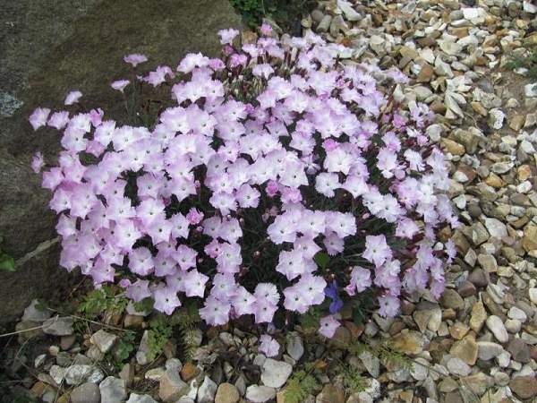 Гвоздика Whatfield Wisp (Вотфилд Висп). Обильноцветущий сорт с подушкой из сизой листвы, полностью усыпанной очень душистыми цветами нежно-розового цвета, по 2-3 на цветоносе.