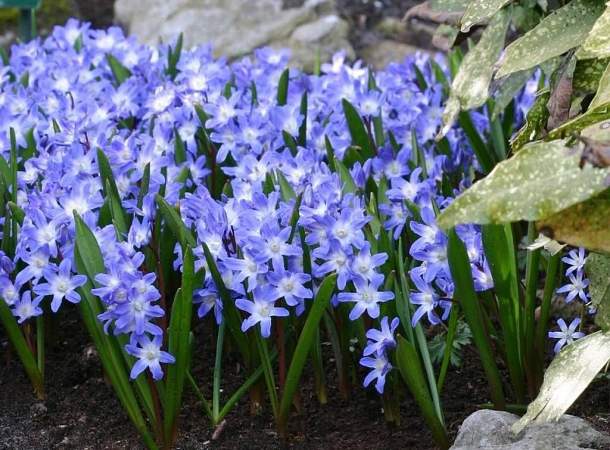 Хионодокса Форбса. Цветки синие с белым центром, диаметром до 3,5 см, собраны в рыхлую кисть. Со временем образуют большую куртину. Цветки очень яркие, светящиеся. Одно из лучших украшений весеннего сада.