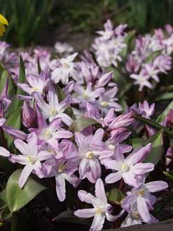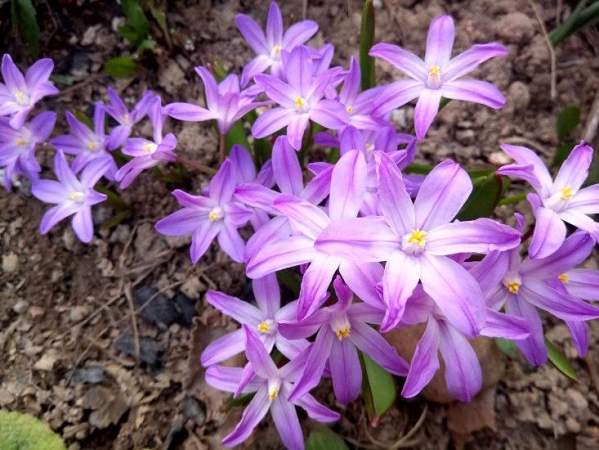 Хионодокса Pink Giant (Пинк Джайант). Цветки нежно-розовые. Высота до 25 см. На цветоносе до 15 цветков диаметром 1-3,5 см, смотрящих вверх и вбок. Соцветие выглядит как вертикальная рыхлая кисть, длина которой больше ширины.