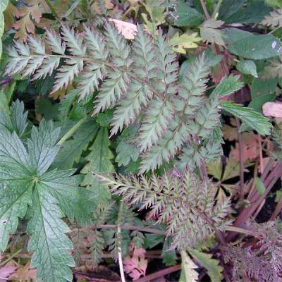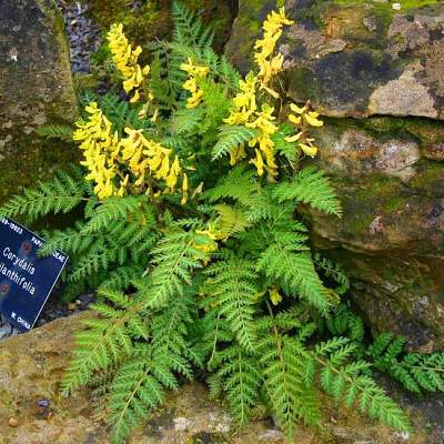 Хохлатка рассеченнолистная. Растение высотой 25-45 см. У него светло-зеленые, раскидистые и дуговидно изогнутые мелкорассеченные листья, похожие на листья папоротников. На зиму они не отмирают, но приобретают приятный бронзовый оттенок. Стебли практически отсутствуют. Цветет в мае. Цветки желтые, но малодекоративные. Главное эстетическое достоинство растения — цвет листьев.