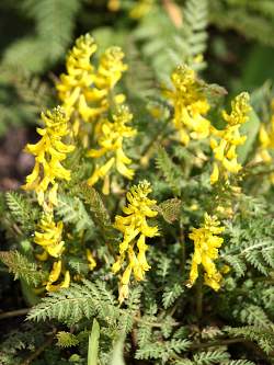 Хохлатка рассеченнолистная. Растение высотой 25-45 см. У него светло-зеленые, раскидистые и дуговидно изогнутые мелкорассеченные листья, похожие на листья папоротников. На зиму они не отмирают, но приобретают приятный бронзовый оттенок. Стебли практически отсутствуют. Цветет в мае. Цветки желтые, но малодекоративные. Главное эстетическое достоинство растения — цвет листьев.