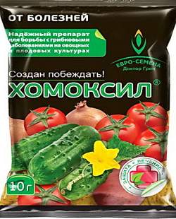 Хомоксил 10 г. Надежный препарат контактного и системного действия для борьбы с грибными инфекциями картофеля, огурца, лука, винограда и томатов и других культур - защищает овощные, плодовые и цветочные культуры от фитофтороза, бурой пятнистости, антракноза, макроспориоза, ложной мучнистой росы, парши, ржавчины, курчавости, гнилей и др.