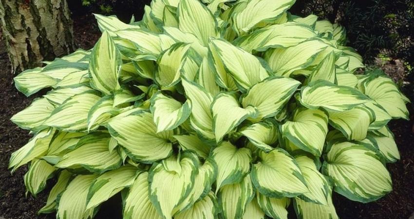 Хоста Albopicta (Альбопикта). Вширь кустарник способен разрастаться до 80-100 см, высота его составляет от 40 до 70 см, эти параметры зависят от созданных условий и правильного ухода. Листья длиной в 20 см имеют способность менять цвет. В начале вегетации они жёлто-зелёные с тёмным обрамлением по краям, к августу приобретают более однородный, бледно-зелёный вид.