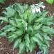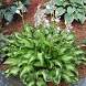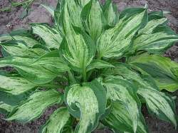 Хоста Allegan Fog (Аллеган Фог). Потрясающий новый сорт! Средняя хоста высотой 35 см. Лист размером 11x8 см, крученый, изгибающийся, широко-ланцетный (широко-копьевидный) с длинным изогнутым острым кончиком. Середина листа белая с нерегулярными штрихами и пятнышками оливкового цвета, кайма малахитово-зелёная. К концу лета зеленеет.