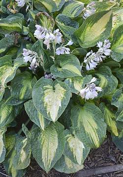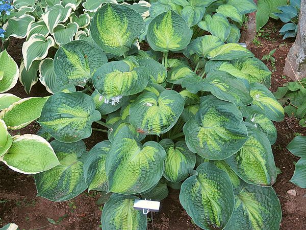 Хоста Alligator Alley (Аллигатор Элли). Листья текстурные, кожистые, с широкой сине-зеленой каймой и шартрезным, позднее желтым центром. Формирует крупный эффектный куст, устойчивый к слизням. Цветы белые.