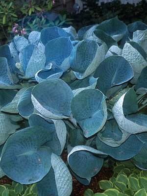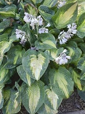 Хоста Alligator Alley (Аллигатор Элли). Листья текстурные, кожистые, с широкой сине-зеленой каймой и шартрезным, позднее желтым центром. Формирует крупный эффектный куст, устойчивый к слизням. Цветы белые.