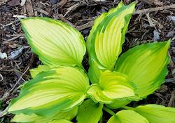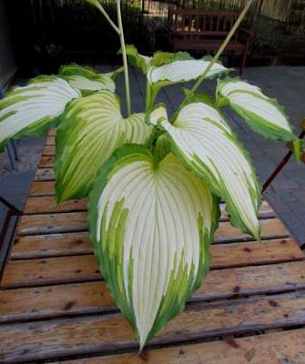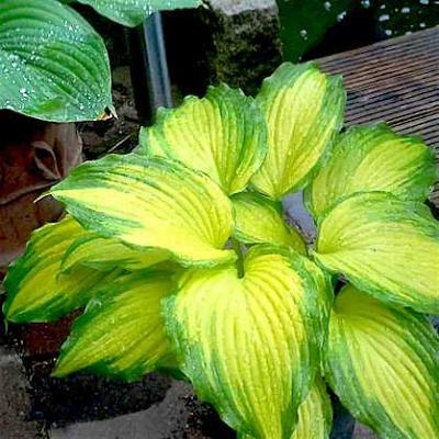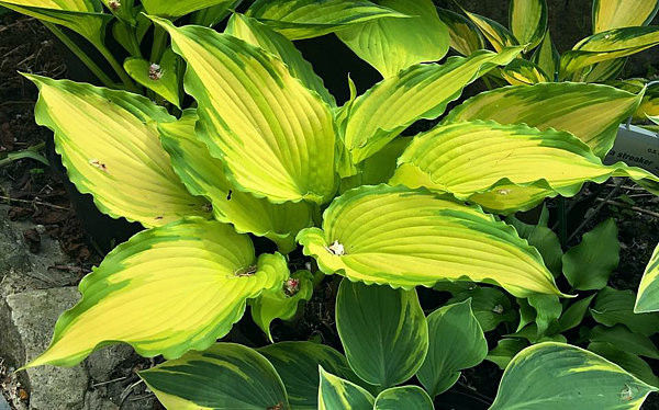 Хоста Amalia (Амалия) — листья овальные с оттянутым острым кончиком, плотные, поникающе-арочные с волнистым зеленым краем, с глубоким жилкованием, сначала желтые, позже белые. Цветы лавандовые. Куст фонтанообразной формы. Эта хоста займет в Вашем саду место Королевы.
