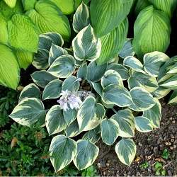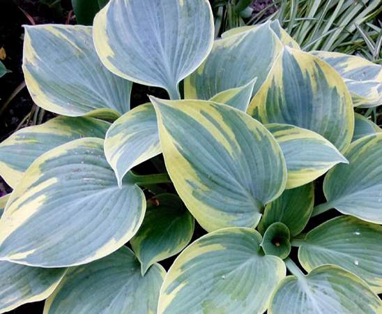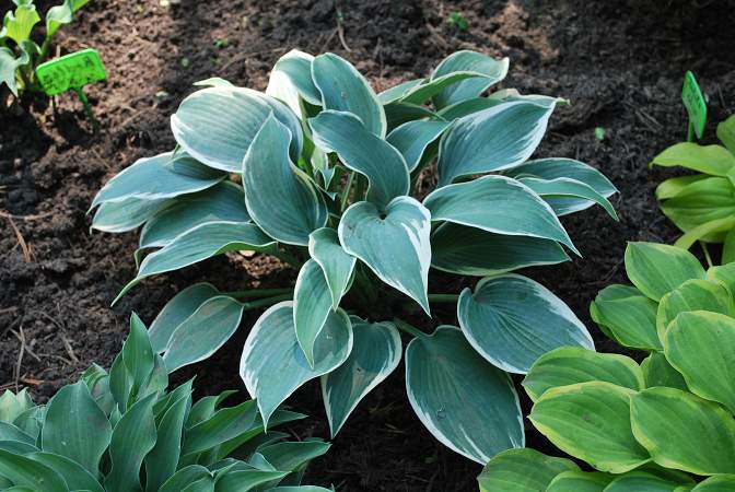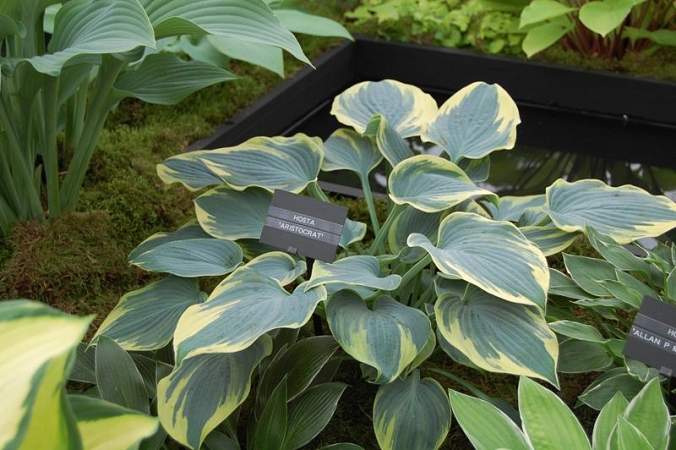 Хоста Aristocrat (Аристократ). Высота растения достигает 45 см, диаметр куста во взрослом состоянии 85 см. Листья плотные, матового дымчато-голубого цвета с широкой беловато-желтой или кремовой каймой. Максимальная декоративность достигается к третьему году после высадки. Цветки бледно-лавандовые.