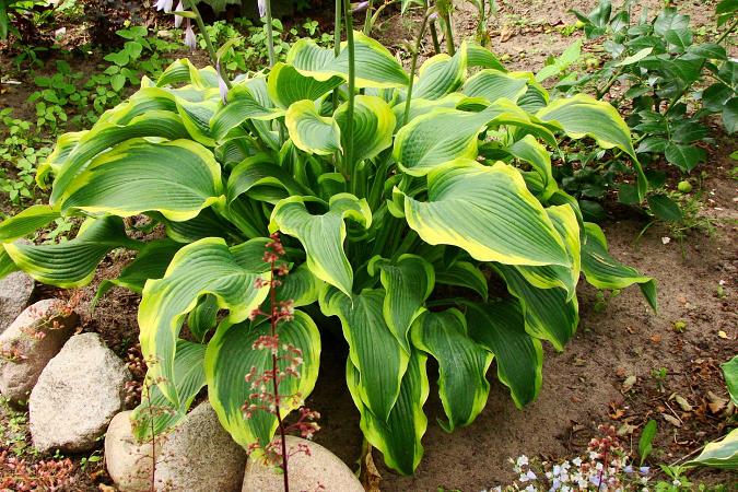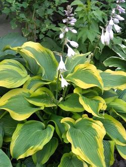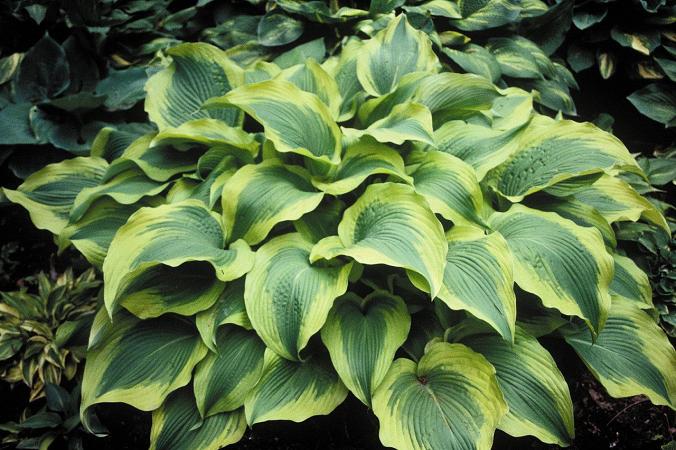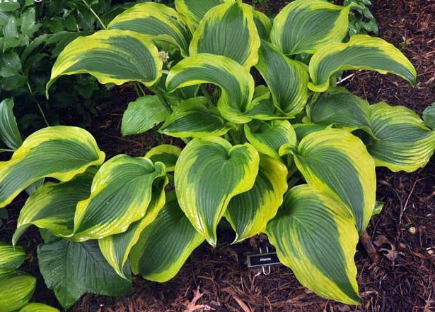 Хоста Atlantis (Атлантис). Изящный ниспадающий куст до 175 см шириной и 75 см высотой. Листья довольно крупные и в ширину достигают более двадцати сантиметров. Листовая пластина очень плотная, ярко-зеленая, с очень широкой каймой от желтого до кремового цвета, с небольшими полосами, заходящими ближе к основанию листа; матовая сверху и с сизым налетом снизу, жилки глубокие бороздчатые, край широко-волнистый. Цветочки лавандового оттенка.