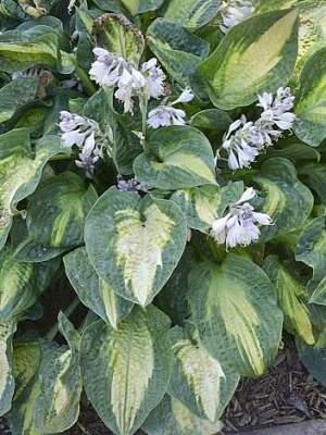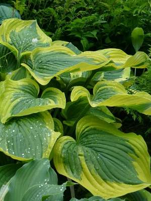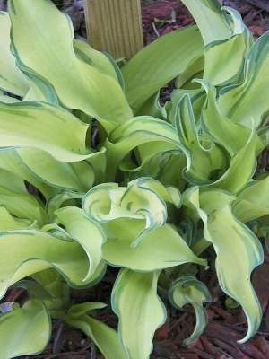 Хоста Atlantis (Атлантис). Изящный ниспадающий куст до 175 см шириной и 75 см высотой. Листья довольно крупные и в ширину достигают более двадцати сантиметров. Листовая пластина очень плотная, ярко-зеленая, с очень широкой каймой от желтого до кремового цвета, с небольшими полосами, заходящими ближе к основанию листа; матовая сверху и с сизым налетом снизу, жилки глубокие бороздчатые, край широко-волнистый. Цветочки лавандового оттенка.