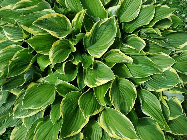 Хоста Aureomarginata (Ауреомаргината). Представляет собой быстрорастущее растение, которое образует красивые и пышные куртины листьев, напоминающие кустарники. В высоту все растение может достигать примерно 40-50 см, в диаметре кустик может разрастаться также до 50 см в молодом возрасте и до 120-130 см в более взрослом возрасте. Листовая пластина имеет сильно рельефную поверхность и остроконечную форму. Этот сорт хосты может похвастаться эффектной расцветкой листвы. В молодом возрасте листья светло-зеленого оттенка с толстой неровной каймой бело-кремового оттенка. С возрастом эта кайма становится менее заметной и более зеленой.