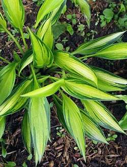 Хоста Ayesha (Айеша). Довольно редкая хоста. Размер SM (от миниатюрного до среднего). Высота около 20 см, ширина 35-40 см. Листья длинные, блестящие с красивыми неравномерными полосами. Цветет в июле, цветки лавандовые.