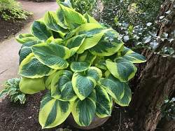 Выведена в 1999 году в результате скрещивания 'Dorothy Benedict' x hypoleuca. Размер средний- крупный, в высоту 55 см, в ширину 65 см. Широкие красивые, изогнутые темно-зеленые листья, коорые окаймлены широкой золотой полосой, которая меняется с течением времени на кремово-белую. Листья достаточно плотные.