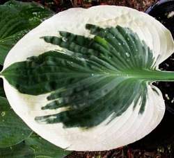 Хоста Barbara Ann (Барбара Энн). Относится к группе больших хост. Листья голубовато-зеленые с широкой кремовой (почти белой) каймой. Крупные (18 х 15 см), жатые. Цветки белые. Требуется скользящая тень.