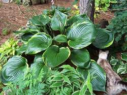 Хоста Beauty Substance (Бьюти Сабстенс). Огромные блестящие округлые листья с горчично-жёлтым окаймлением. Основной цвет очень глубокий и темный — зеленый с отливом цвета морской волны. Листья шикарные, фактурные, блестящие. Рамер extra large. Цветки светло-сиреневые. Хорошо растёт в тени, полутени и на более открытом месте. Спорт от хосты Sum and Substance.