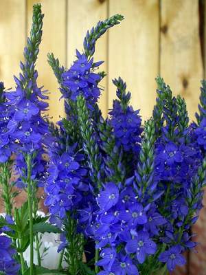 Цветок раскрытый воронкообразный, от бледно-лавандового до почти белого, в плотной кисти, держится долго, на прочном прямом облиственном серо-зеленом стебле высотой 120 см; цветение в середине-конце лета.