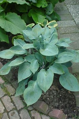 Хоста Blue Stilton (Блу Стилтон). Многолетнее цветущее травянистое растение с декоративной листвой голубовато-зеленого цвета. Розетка компактная. Высота куста хосты 65 см, ширина 45 см. Зацветает хоста в июле. Цветок лавандовый.