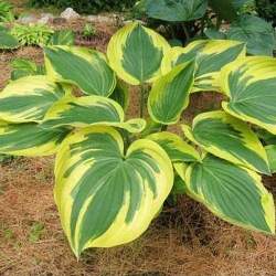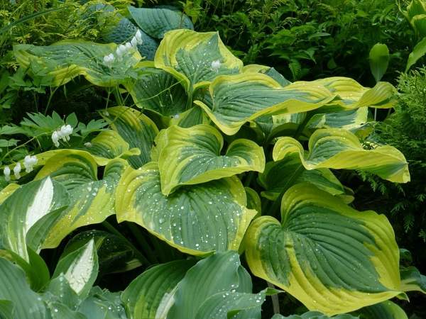 Хоста Broad Band (Брод Бэнд). Среднего размера хоста высотой 45-50 см и шириной 90 см. Листья размером 24 х 20 см, сердцевидные, тёмно-зелёные с широкой нерегулярной жёлтой каймой, которая летом становится кремово-белой. Кайма слегка волнистая. Цветки бледно-лавандовые. Цветение в августе. Место полутенистое.