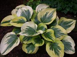 Хоста Broadway (Бродвей). Прекрасный новый спорт от хосты Border Street. Внутренний рисунок — сердцевидный узор серо-зеленого цвета, кайма — широкая, неравномерная, яркого сливочно-желтого цвета. Листья достаточно плотные, немного жатые. Цветы белые. Место посадки — солнце-тень. Группа Medium-Large.