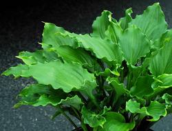 Хоста Candy Dish (Кенди Диш). Листья сердцевидные, очень толстые, блестящие, с глубоким жилкованием, тёмно-зелёные с изумительной гофрировкой по краю, цветы лавандовые. Место посадки: солнце-тень.