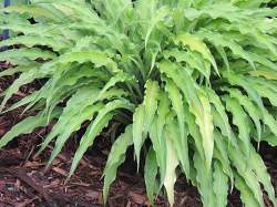Хоста Curly Fries (Кёрли Фрайз). Эффектный миниатюрный сорт. Листья очень узкие, длинные, гофрированные, изогнутые. Структура плотная. Цвет листьев — от золотисто-зеленого до шартрезного оттенка, с восковым налетом. Цветоносы сизо-бурые, длинные, цветки светло-лавандовые. Для посадки подойдет солнечное (утреннее солнце), тенистое или полутенистое место.