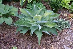 Хоста Cutting Edge (Каттинг Эдж). Листья стреловидные, вытянутые, гофрированные, зелёно-голубые с глубоким жилкованием, с изнанки серые. Куст плотный, красивой формы. Цветы светло лавандовые. Размер medium-large.