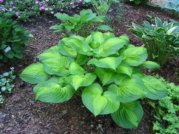 Хоста Dance with Me (Данс виз Ми). Происхождение: спорт от 'Summer Music' Размер M-L, 40-50 см. Хоста Dance With Me имеет великолепный плотный лист сердцевидной формы салатово-желтого цвета с широкой изумрудно-зеленой каймой.