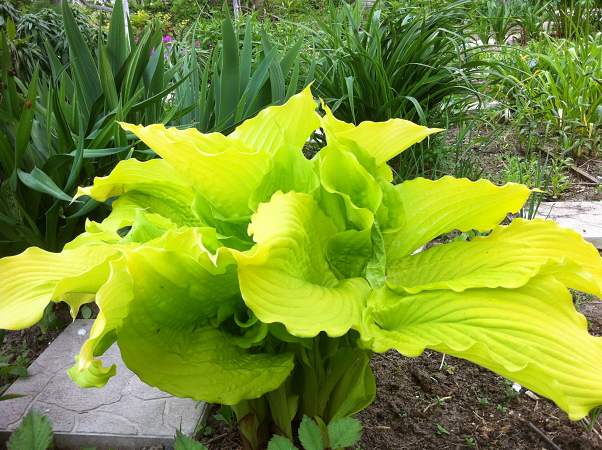 Хоста Dancing Queen (Дансинг Куин). От этой хосты невозможно отвести взгляд! Крупные ярко-желтые листья формируют правильный, округлой формы, крупный куст. Края широких, с ярко выраженными жилами листьев струятся волнами. Цвет держится до конца сезона, немного выцветая до сине-белого. Размер large.