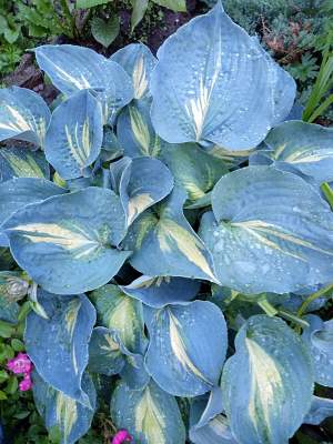 Хоста Don Stevens (Дон Стивенс). Относится к большим хостам, 60 на 100 см. Листья крупные, широкие с острыми кончиками, слегка гофрированные и волнистые. Цветет лавандовыми цветками.