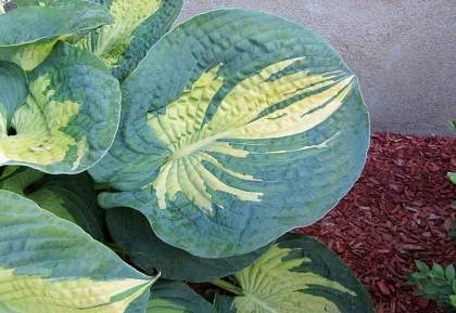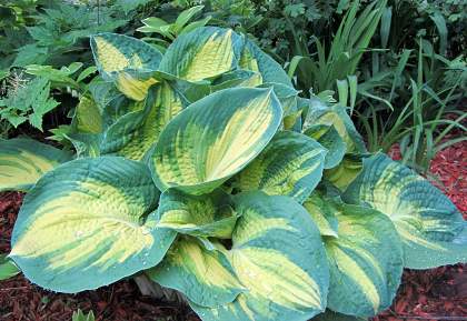 Хоста Dream Weaver (Дрим Вивэ). Высота растения 40 см, диаметр куста во взрослом состоянии 75 см. Листья плотные, голубовато-зелёные с кремово-жёлтым центром.