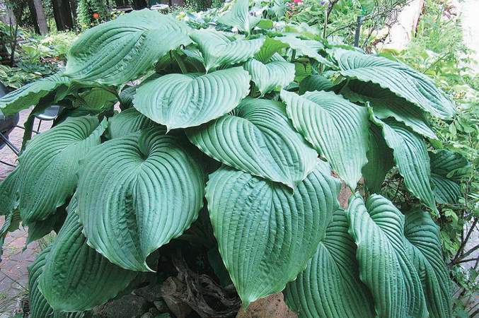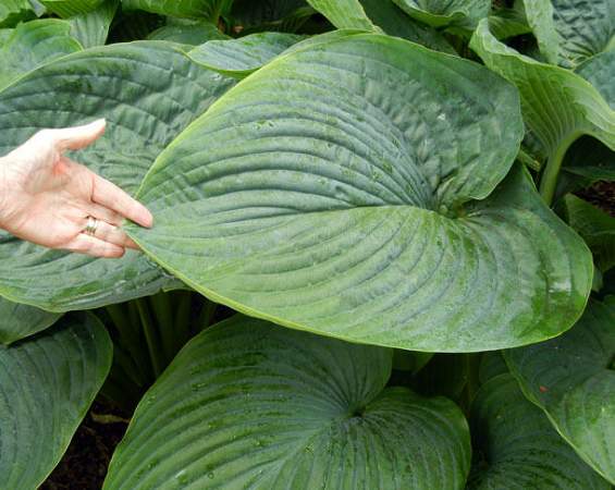 Хоста Empress Wu (Эмпресс Ву). Высота растения 100 см, диаметр куста во взрослом состоянии 165-170 см. Очень крупная хоста. Листья жёсткие, рифленые тёмно-зелёные, весной приобретают голубоватый оттенок за счет воскового налета. Цветки светло-сиреневые. Крупный куст данного сорта эффектно смотрится при посадке солитерно. Также хорошо сочетается с другими декоративнолистными и красивоцветущими культурами.
