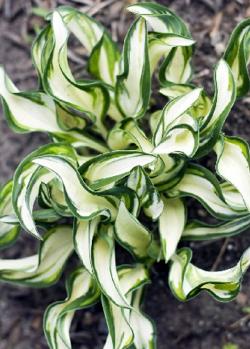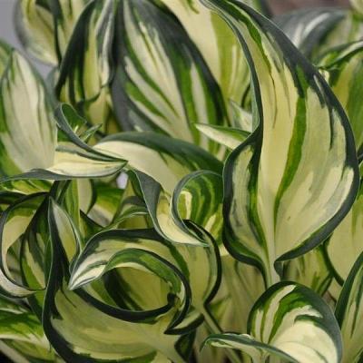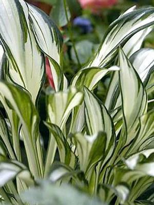 Хоста Fireworks (Фаерворкс). Маленькая хоста с узкими плотными листьями с белым центром и неравномерными зеленоватыми штрихами по центру и краям. Лавандовые цветы. Предпочитает посадку в легкой тени. Спорт хосты 'Loyalist'.