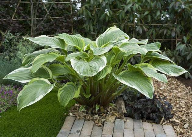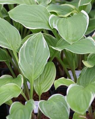 Хоста Fragrant Fire (Фрейгрант Файр). Многолетнее цветущее травянистое растение с декоративной листвой зеленого цвета с узким кремовым кантом. Листья глянцевые, стебли с красноватым оттенком. Высота куста хосты 50 см, ширина 75 см. Зацветает хоста в июле. Цветок белый.