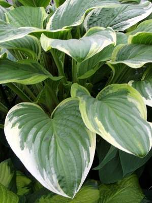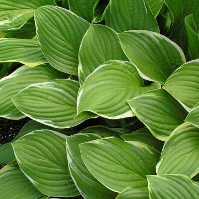Хоста Fragrant Fire (Фрейгрант Файр). Многолетнее цветущее травянистое растение с декоративной листвой зеленого цвета с узким кремовым кантом. Листья глянцевые, стебли с красноватым оттенком. Высота куста хосты 50 см, ширина 75 см. Зацветает хоста в июле. Цветок белый.