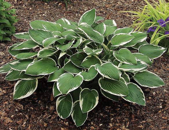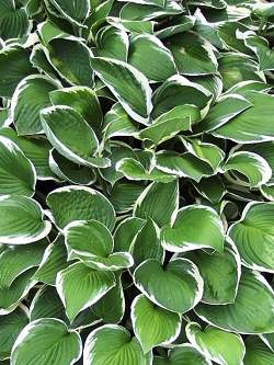 Хоста Francee (Франси). Листья сердцевидной формы тёмно-зелёные, с ярко выраженным жилкованием, морщинистые. Окаймление белоснежное с самого начала разворачивания листвы весной и до конца сезона. Цветы лавандовые. Быстро нарастает. Предпочитает тень, полутень. Отличный неприхотливый сорт.