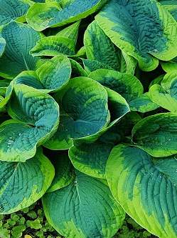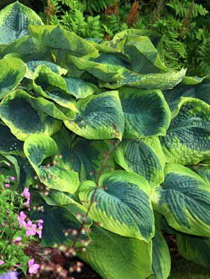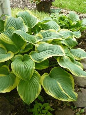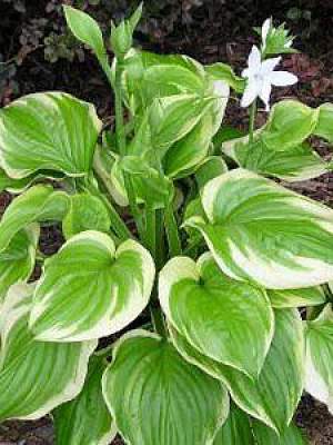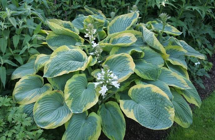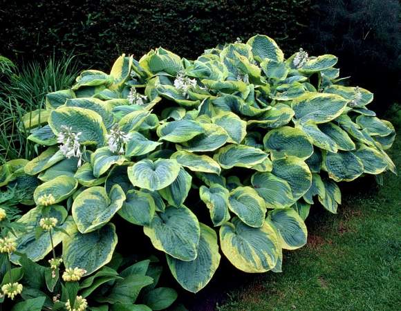 Хоста Frances Williams (Фрэнсиз Вилльямс). Высота растения 65 см, диаметр куста во взрослом состоянии 100 см. Позволит без лишних хлопот сделать садовый участок неповторимым. Этот многолетник потрясающе смотрится, благодаря своей двухцветной окраске. В начале лета растение начинает цвести, повышая свои декоративные свойства. Листья очень крупные, плотные, зеленовато-синего цвета с желтой окантовкой. В конце июня — начале июля появляются соцветия белого цвета, располагающиеся на коротком стебле. Растение быстро разрастается, покрывая землю плотным ковром.