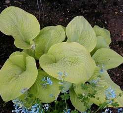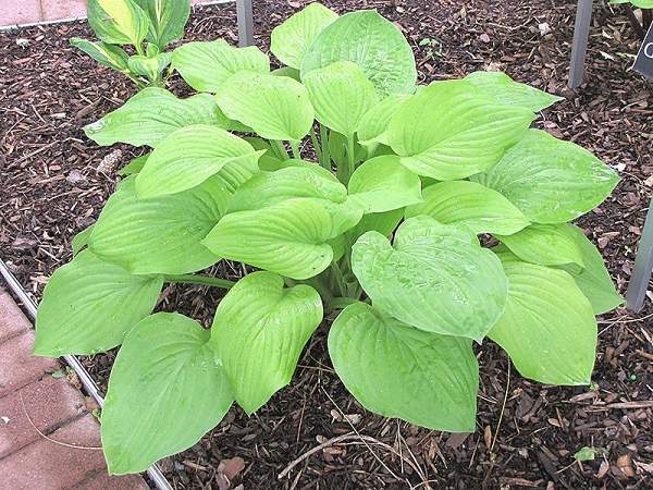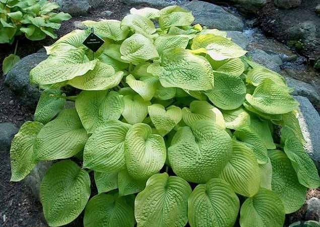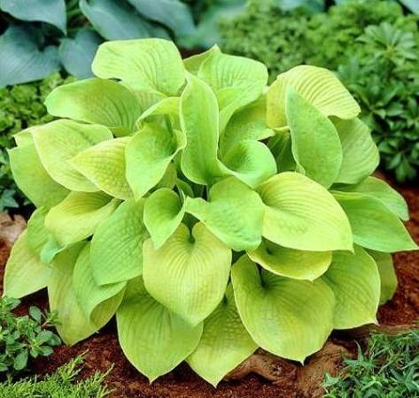 Хоста Golden Sunburst (Голден Санбёрст). Крупная, с округло-вытянутыми, до 20-35 см, жатыми жёлтыми листьями с лимонным оттенком. Куртина плотная, густая, быстро нарастает, высотой до 40-60 см. Цветение в июле-августе, обильное и долгое, крупными сиреневыми цветами. Неприхотлива, растёт быстро, более яркая при посадке в светлые места на некислые почвы.
