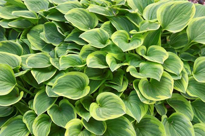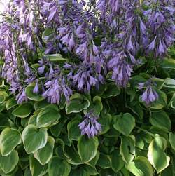 Хоста Golden Tiara (Голден Тиара). Высота куста 30 см и ширина 40 см. Светло-зелёные листья сердцевидной формы с золотисто-жёлтым окаймлением. Цветы многочисленные, сиреневые. Разрастается очень быстро, образуя красивые округлые куртины из маленьких аккуратных листьев.
