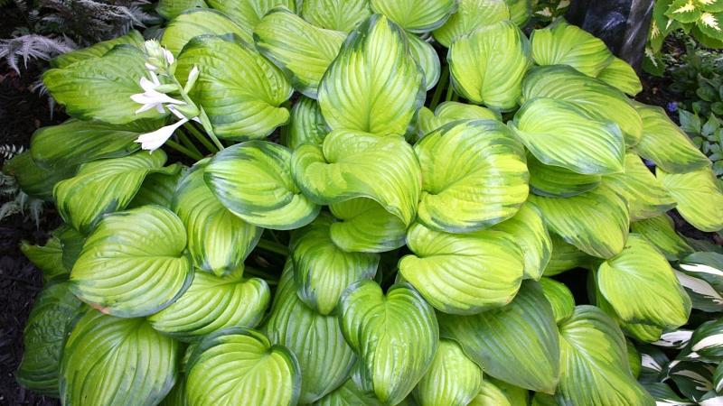 Хоста Guacamole (Гуакамоле). Эффектная хоста среднего размера, устойчивая к солнцу, быстро разрастается. Высота листьев 60 см, высота цветоносов 80-90 см. Листья гофрированные, яблочно-зелёные с нерегулярной широкой тёмно-зелёной каймой, очень блестящие. Цветки белые, большие, ароматные. "Хоста года", 2002.
