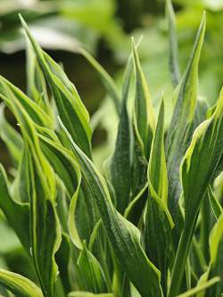 Хоста Hands Up (Хэндс Ап). Листья стреловидные, волнистые, вертикальные, перекрученные, трубообразной формы с очень выпуклыми жилками, на длинных черешках. Тёмно-зелёные с каймой, цветки лавандовые. Спорт от хосты "Praying Hands".