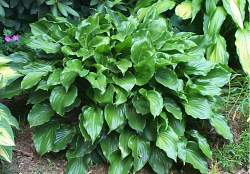 Хоста Invincible (Инвинсибел). Очень блестящие кожистые листья, слегка волнистые, с оттянутой верхушкой. Ярко-зелёные. Прекрасные текстура и качество листа. Душистые лавандовые цветы.