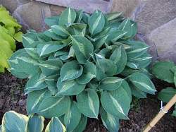 Хоста Kiwi Full Monty (Киви Фул Монти). Зелёно-голубые листья, на которых узкие белые полоски обрамляют центральную кремовую часть. Спорт хосты Striptease — те же параметры, тот же рисунок. Отличие в голубоватой окраске листа. Полутень.