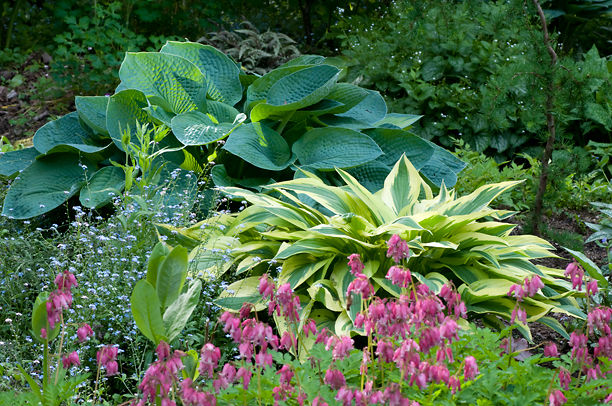 Обычно хосты высаживают с гейхерой, садовыми геранями, наперстянкой, астильбой, медуницей, аквилегией, осенней анемоной, папоротниками, астранцией и другими декоративными многолетниками.
