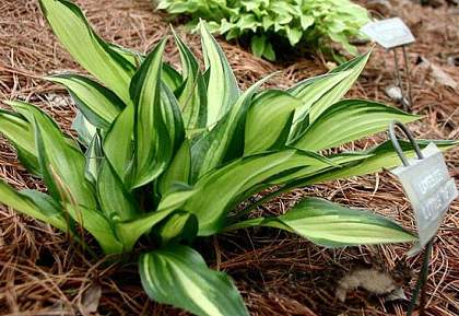 Хоста Lakeside Little Tuft (Лейксайд Литл Тафт). Маленькая хоста. Высота 15 см. Диаметр 30 см. Листья ланцетные, кремово-белые с ярко-зеленой каймой, волнистые. Длина листа 13 см. Цветки светло-фиолетовые, появляются на невысоких цветоносах в июле. Разрастается быстро.